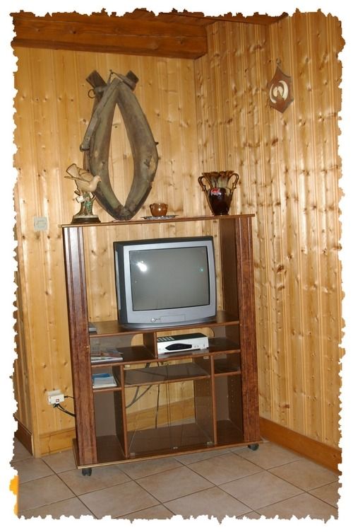 Salon/ salle à manger équipé d’une banquette et d’un téléviseur couleur