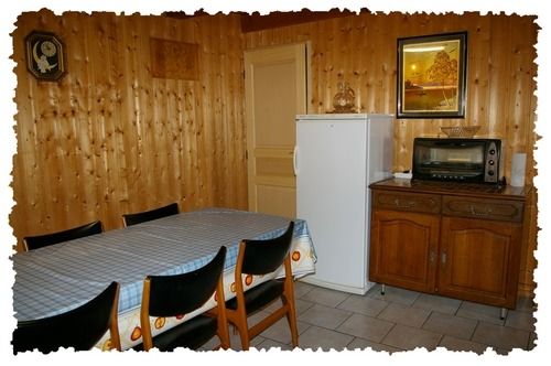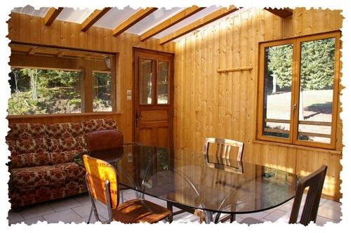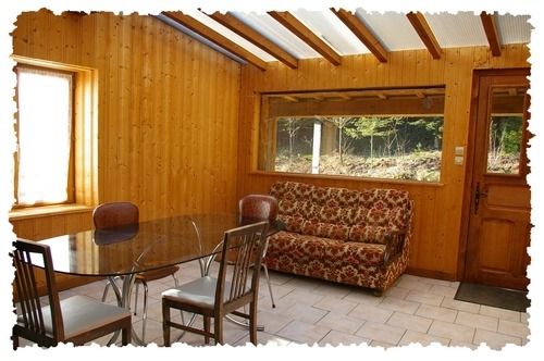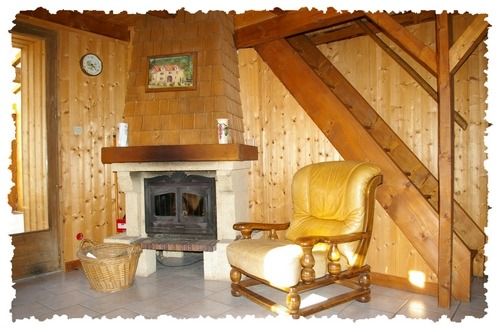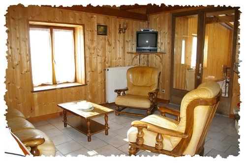 Salon équipé d’une banquette, d’un téléviseur couleur et d'une cheminée dont le bois est fourni, en plus du chauffage central, pour votre plus grand confort