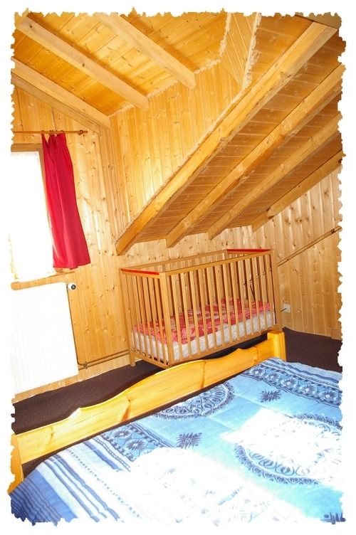 Chambre n°1 : un lit deux personnes, une armoire, ainsi que pour bébé : lit, chaise et baignoire.